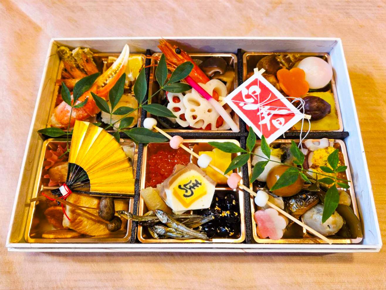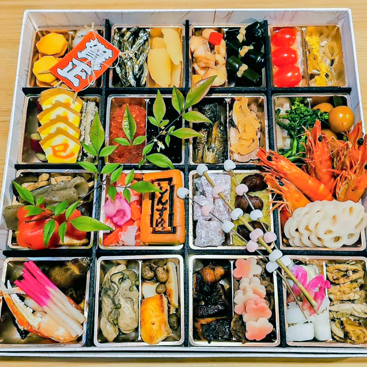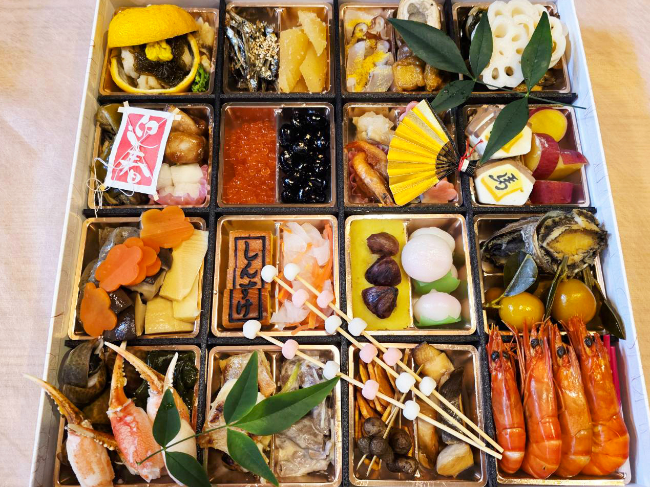 縁起の良い品を48種(いくら、エビ、アワビ、ふく、広島和牛など)を盛り込みます。