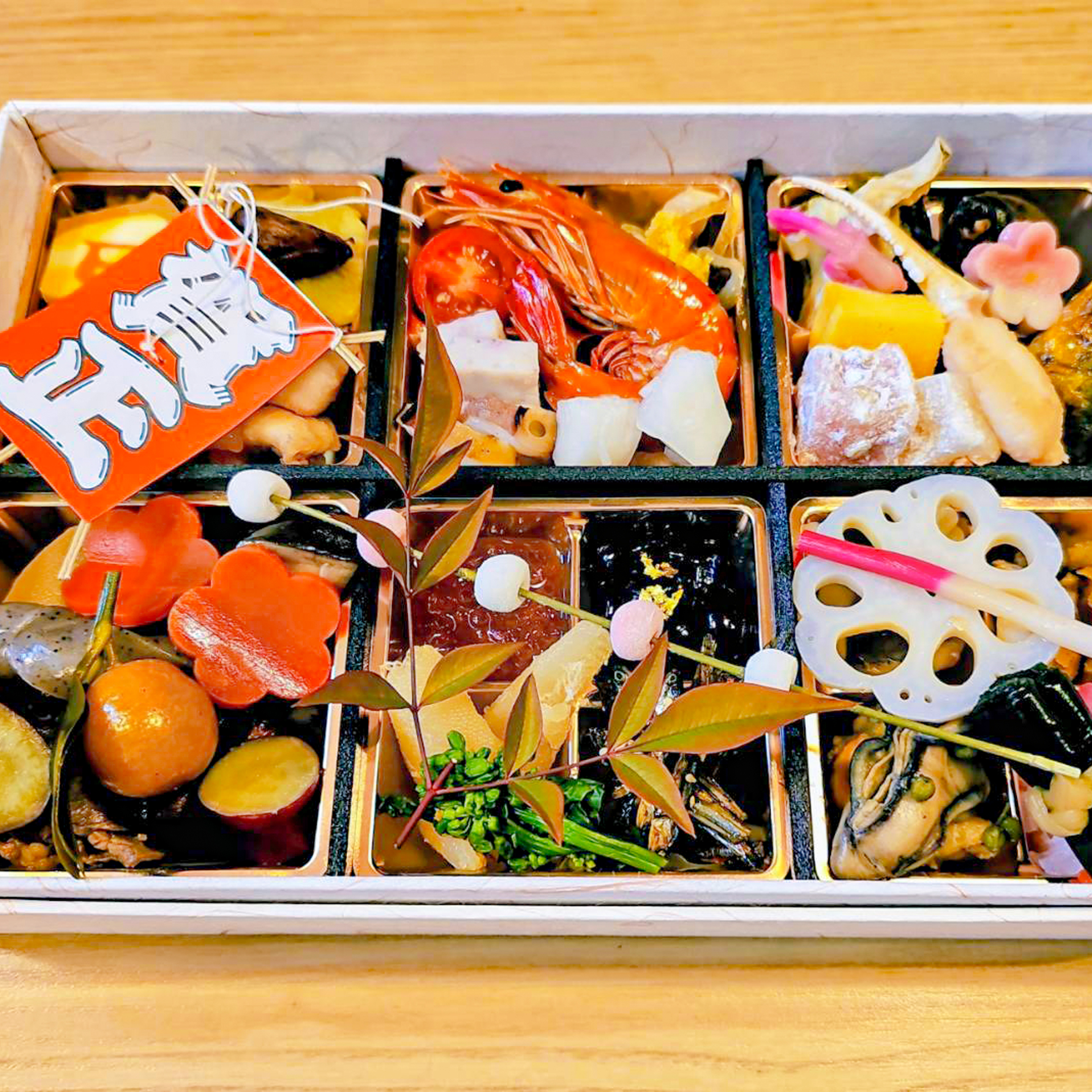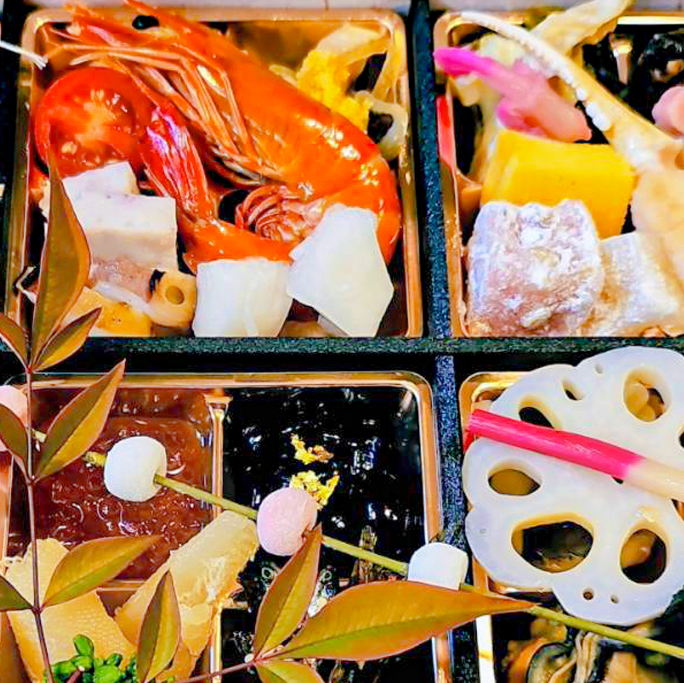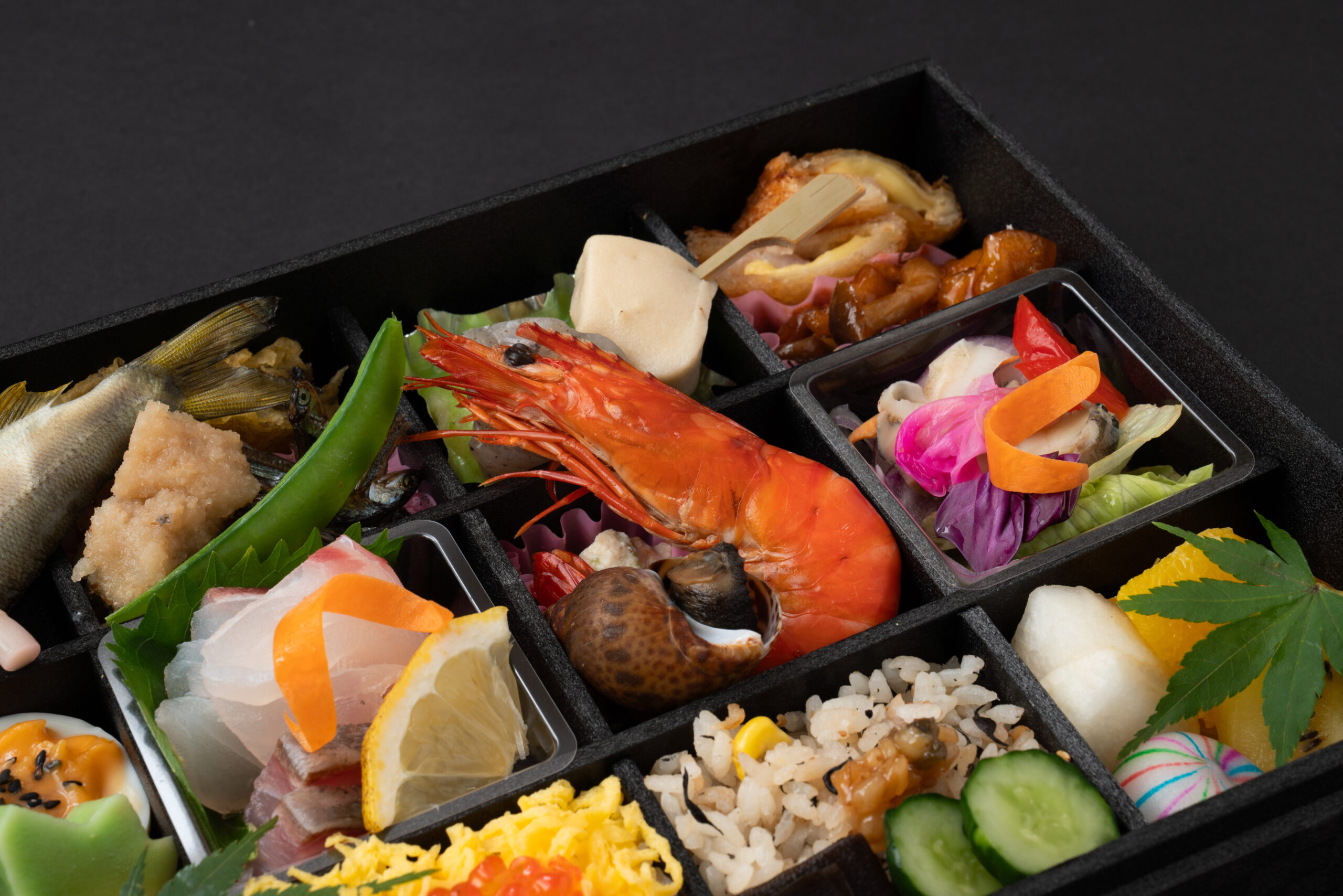 縁起の良い品を48種(いくら、エビ、アワビ、ふく、広島和牛など)を盛り込みます。
