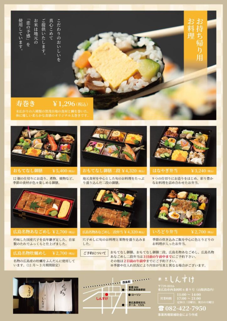 おもてなし御膳、おもてなし御膳二段、広島名物あなごめし、広島名物あなごめし二段弁当は3日前の午前中までにご予約下さい。